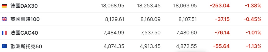 2. 截至发稿,德国DAX指数跌1.38%,英国富时100指数跌0.45%,法国CAC40指数跌1.01%,欧洲斯托克50指数跌1.13%。