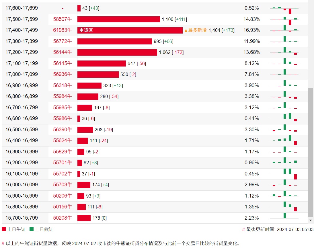 牛证街货重货区和最多新增都在17400-17499区间,该区间最新牛证数量为1404张,较上一交易日增加173张。