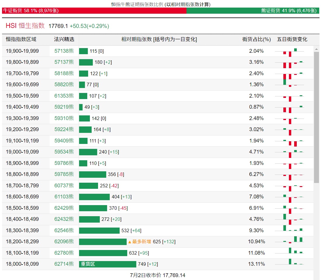 智通财经APP获悉,截至7月3日,恒指最新的牛熊街货比例为58:42。