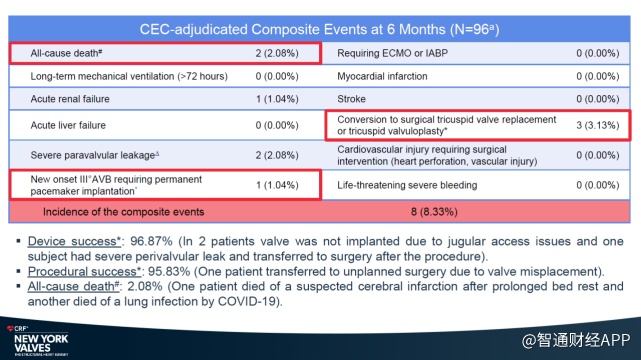 根据最新披露的6个月期临床试验数据,LuX-Valve Plus在安全性与有效性方面双双表现优异。其中,安全性结果显示,复合事件发生率仅为8.33%。其中,心梗、卒中、使用ECMO(体外膜肺氧合)或IABP(主动脉内球囊反搏)、急性肝功能衰竭、长期机械通气(>72小时)、需要外科干预的心血管损伤(心脏穿孔、血管损伤)、危及生命的大出血事件发生率均为0。全因死亡率仅为2.08%,急性肾脏衰竭、重度瓣周漏和中转外科三尖瓣置换或成形术发生率分别为1.04%、2.08%和3.13%,新发III度房室传导阻滞需植入永久心脏起搏器的发生率仅1.04%。