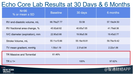 有效性结果显示,患者的反流等级、心功能等级,以及生活质量显著改善,其中100%的患者和97.62%的患者分别在30天和6个月期时显示无中度及以上反流,同时患者右心系统重构也获得受益。