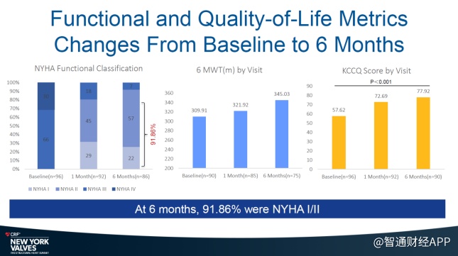 而在纽约心脏协会(NYHA)心功能改善方面,30天数据显示80.43%的患者由术前III/IV级提升至I/II级,6个月期数据显示91.86%的患者由术前III/IV级提升至I/II级;在生活质量方面,患者堪萨斯城心肌病变问卷(KCCQ)评分在30天平均提升15分,在6个月期平均提升20分。