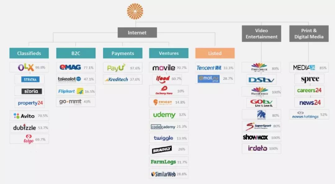 Naspers是一家跨国传媒集团,普遍称之为“南非报业”。成立于1915年,于1994年9月在约翰内斯堡交易所上市,目前市值非洲第一,福布斯世界排名119。经过多年发展,Naspers已从一个从事传统印刷的传统媒体公司已发展成为业务涉及多个市场的电子媒体公司(经营范围多达130个国家),同时也是世界性科技投资公司,其投资项目包括腾讯、 Mail.ru (俄罗斯互联网巨头)、Delivery Hero(全球最大外卖公司)和OLX(全球最大分类信息网站)。