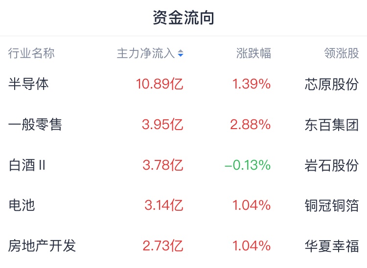 主力资金方面,资金青睐半导体、零售、白酒、电池等行业;资金出逃软件、电力、消费电子等行业。