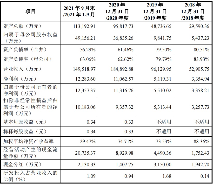 财务方面,恒昌医药分别于2018年、2019年、2020年、2021年1-9月份分别实现营收约为5.29亿、9.61亿、18.49亿、14.95亿人民币,净利润分别约为3354.94万、5119.31万、1.11亿、1.23亿人民币。