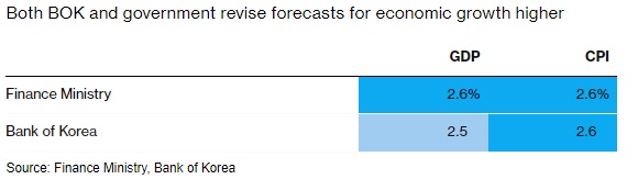 对此,韩国财政部在周三发布的声明中表示,该政府预计2024年国内生产总值(GDP)将增长2.6%,较之前2.2%的预测有所提高。与此同时,通胀预期保持在2.6%,与韩国央行的预测相一致。