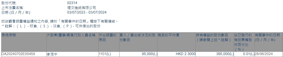 智通财经APP获悉,香港联交所最新资料显示,6月28日,执行董事李浩中增持理文造纸(02314)9.5万股,每股作价2.3港元,总金额约为21.85万港元。增持后最新持股数目约为39.5万股,最新持股比例为0.01%。