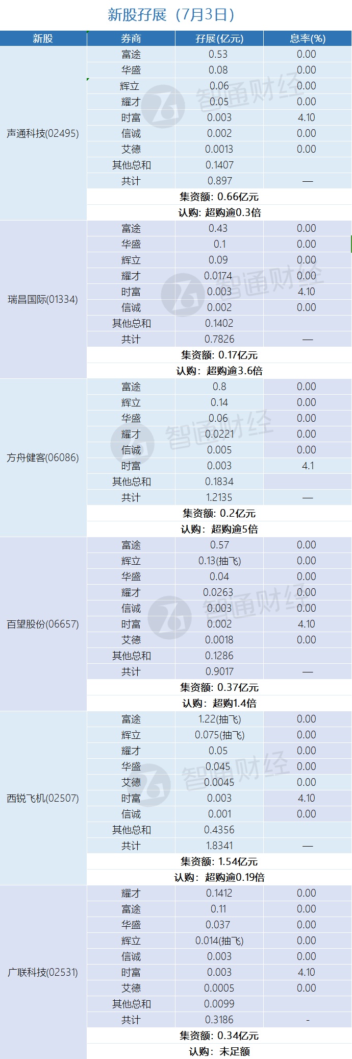 智通财经APP获悉,声通科技(02495)、瑞昌国际(01334)等正在招股中。截止7月3日,辉立、华盛等券商合计分别为声通科技借出0.897亿港元,认购逾0.3倍;为瑞昌国际借出孖展0.7826亿港元,认购逾3.6倍;为方舟健客(06086)借出孖展1.2135亿港元,认购逾5倍;为百望股份(06657)借出孖展0.9017亿港元,认购逾1.4倍;为西锐飞机(02507)借出孖展1.8341亿港元,认购逾0.19倍;为广联科技(02531)借出孖展0.3186亿港元,认购未足额。