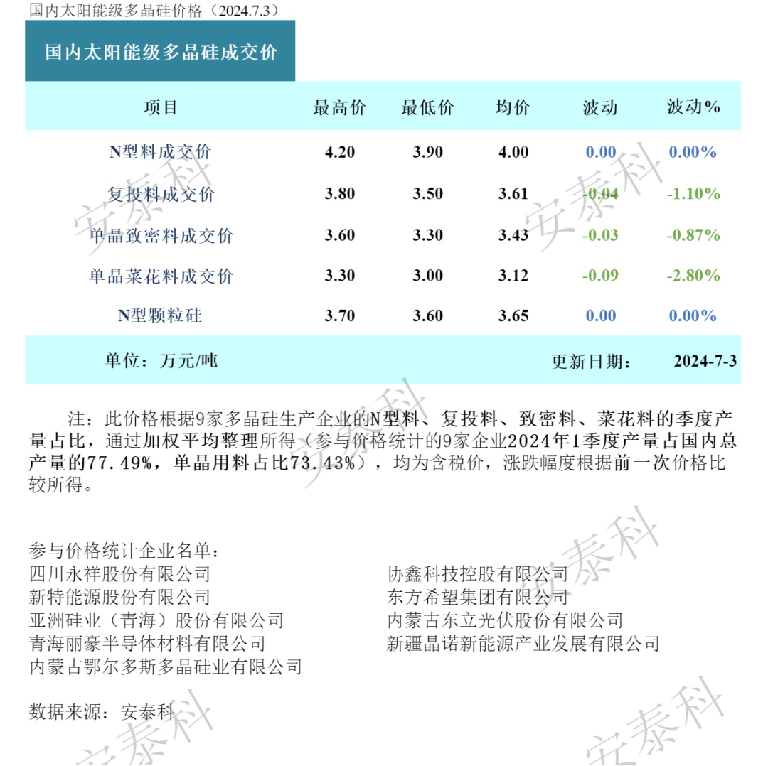 智通财经APP获悉,中国有色金属工业协会硅业分会发文称,本周多晶硅n型产品价格稳定,p型产品价格略有下调。n型棒状硅成交价格区间为3.90-4.20万元/吨,成交均价为4.00万元/吨,环比持平;单晶致密料成交价格区间为3.30-3.60万元/吨,成交均价为3.43万元/吨,环比下降0.87%。n型颗粒硅成交价格区间为3.60-3.70万元/吨,成交均价为3.65万元/吨,环比持平。