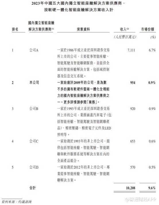根据灼识咨询的资料,按2023年软硬一体化智能座舱解决方案的收入计算,公司是为中国OEM提供智能座舱解决方案的第二大独立本土供应商;2023年,公司成为首批在中国提供采用高通公司第四代骁龙8295芯片的智能座舱解决方案的公司之一,产品结构逐步向高端化转变。