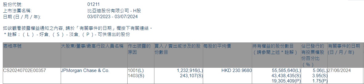 智通财经APP获悉,香港联交所最新资料显示,6月27日,小摩增持比亚迪股份(01211)123.2916万股,每股作价230.968港元,总金额约为2.85亿港元。增持后其持股数目约为5558.56万股,最新持股比例为5.06%。