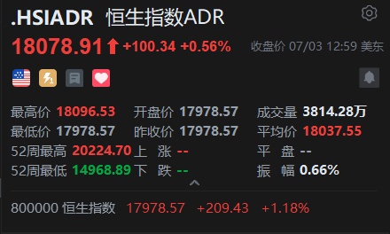 智通财经APP获悉,周三美股三大指数涨跌不一 ,恒生指数ADR上涨,按比例计算,收报18078.91点,较香港收市上涨100.34点或0.56%。