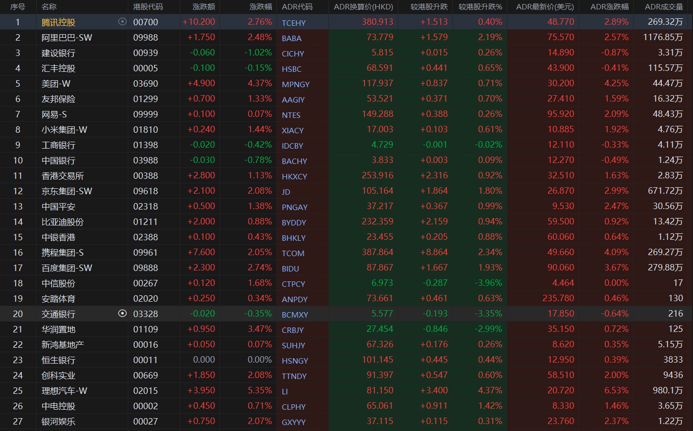 大型蓝筹股多数上涨,汇丰控股收报68.591港元,较香港收市上涨0.65%;腾讯控股收报380.913港元,较香港收市上涨0.40%。