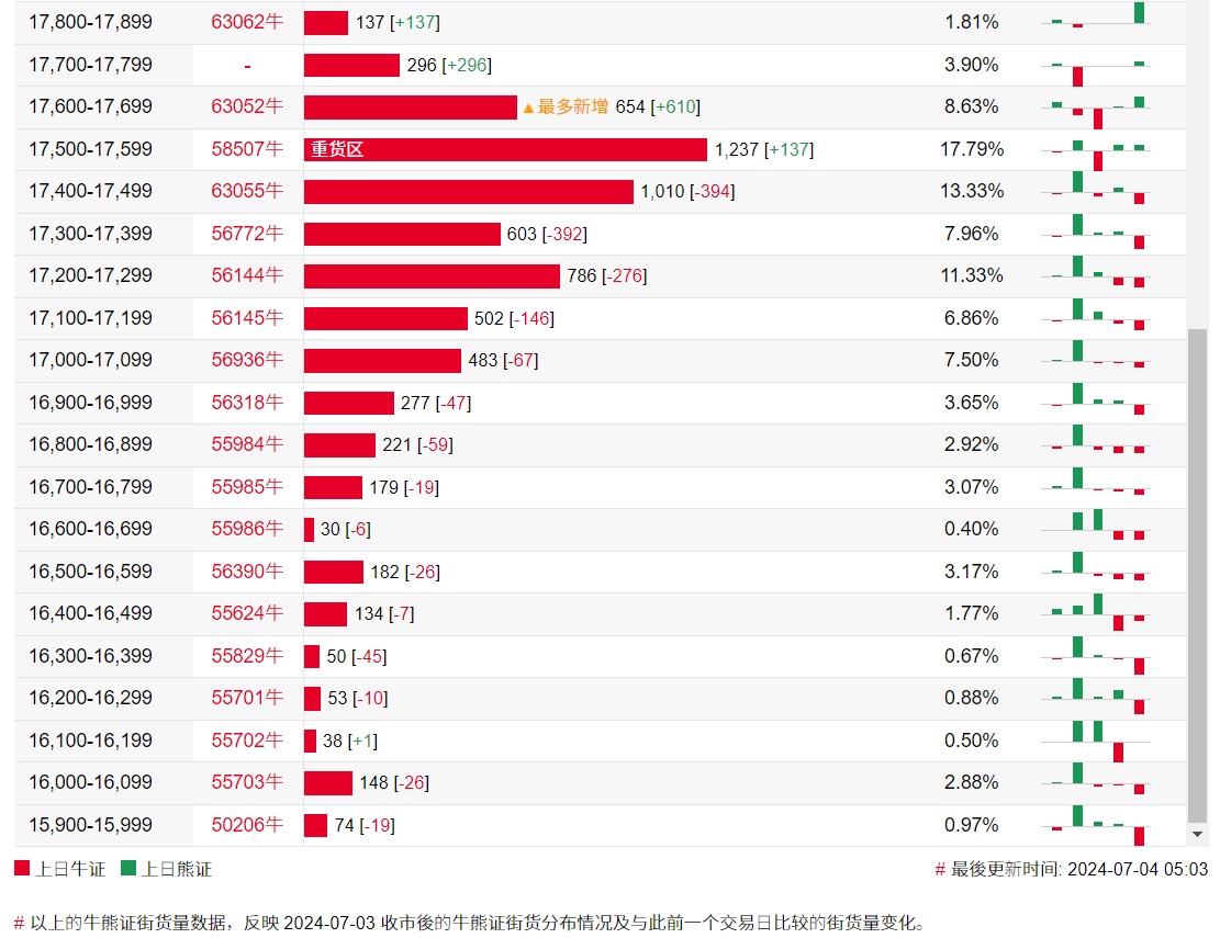 牛证街货重货区在17500-17599区间,该区间最新熊证数量为1237张,较上一交易日增加137张;最多新增在17600-17699区间,该区间最新牛证数量为654张,较上一交易日增加610张。