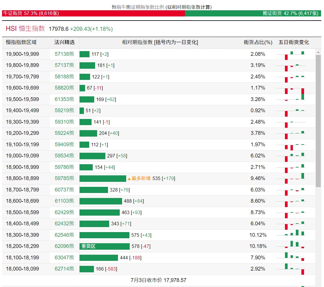智通财经APP获悉,截至7月4日,恒指最新的牛熊街货比例为57:43。