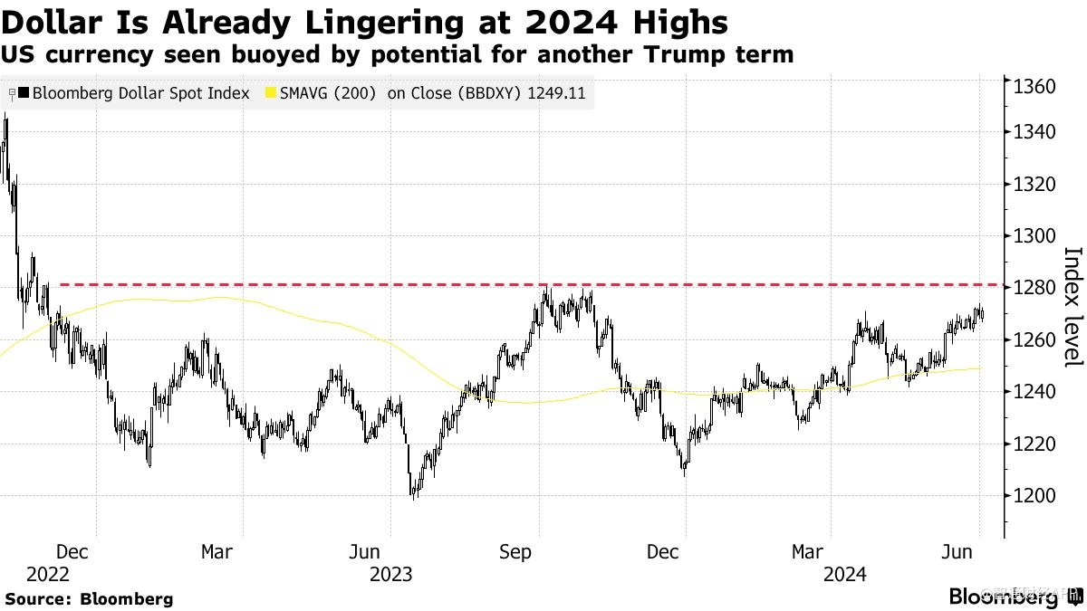 在上周的辩论结束后的几个小时里,美元走高,这是市场将如何适应特朗普可能获胜的最早信号之一。今年美联储有意在更长时间内保持较高利率的迹象提振了美元,但随着特朗普在与拜登的对峙中占据主导地位,美元也出现了明显的实时波动。