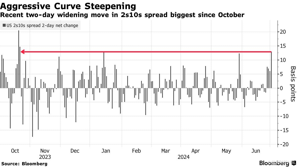 在上周晚些时候开始的两天时间里,10年期美国国债收益率相对2年期国债收益率上升约13个基点,为去年10月以来曲线陡峭化幅度最大的一次。