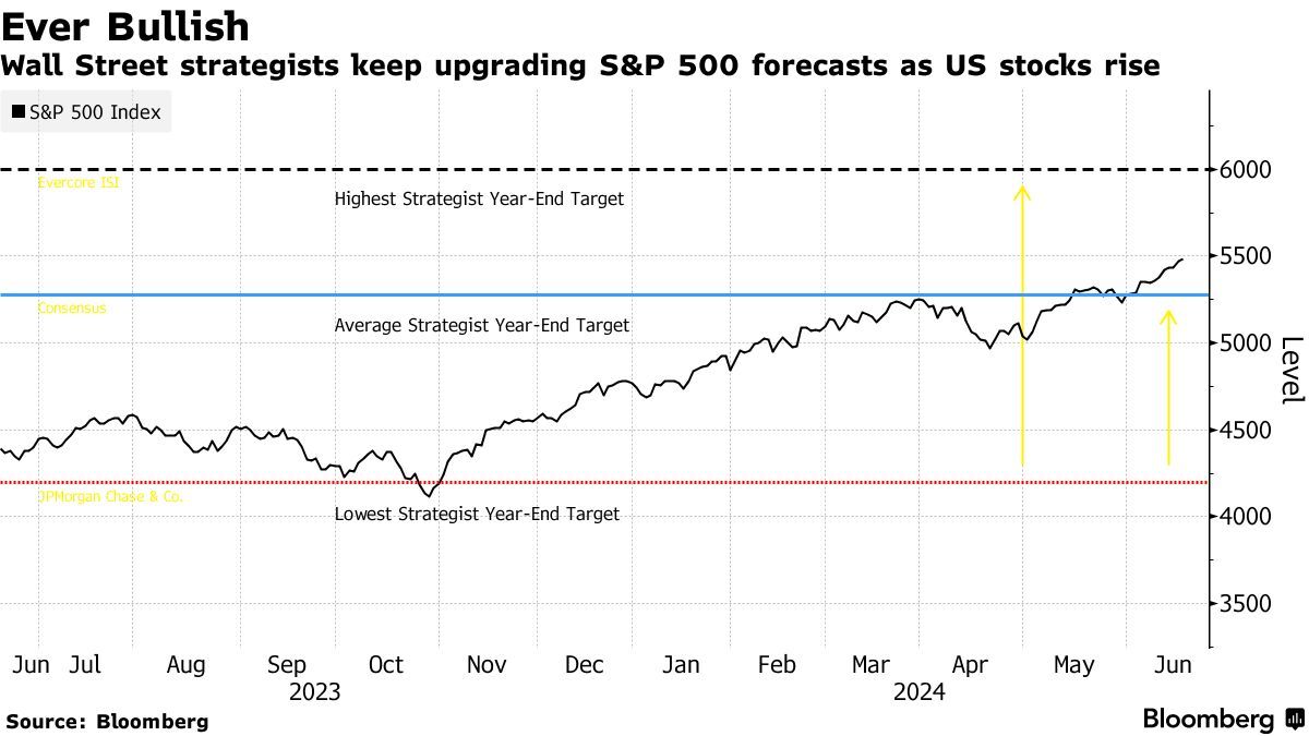 此外,一项在6月对策略师的调查显示,标普500指数年终目标的最高和最低点位相差43%,为过去15年的调查中第二高的,仅次于2023年。