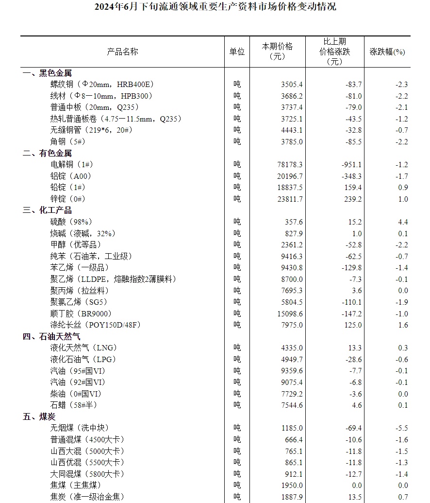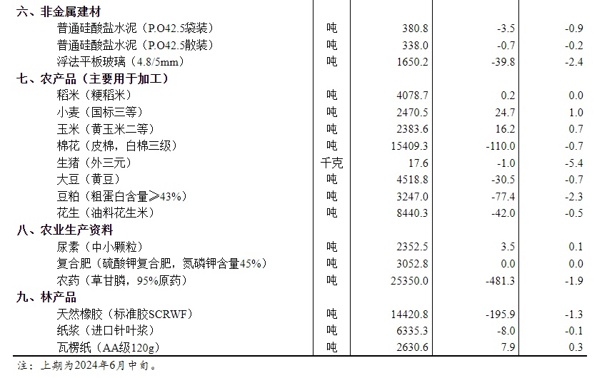 智通财经APP获悉,国家统计局公布数据显示,据对全国流通领域9大类50种重要生产资料市场价格的监测显示,2024年6月下旬与6月中旬相比,12种产品价格上涨,33种下降,5种持平。其中,生猪(外三元)价格为17.6元/千克,较上期价格下降5.4%。