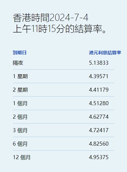 智通财经APP获悉,7月4日,港元拆息普遍向下,但隔夜息高见5.13833%,创逾两个月新高,一星期拆息再跌4基点,报4.39571%,为6月21日以来最低,而与楼按相关的一个月拆息连跌六天,报4.5128%,见近三周新低。