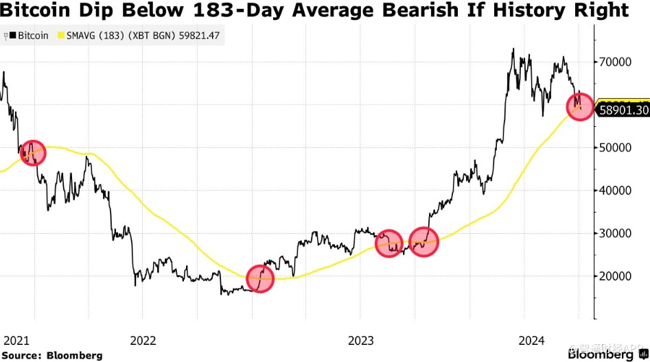 投机者正在仔细研究比特币的技术图表,该代币收盘价略低于六个月移动平均价格。Bloomberg汇编的数据显示,如果以历史为鉴,这种突破预示着进一步下跌。