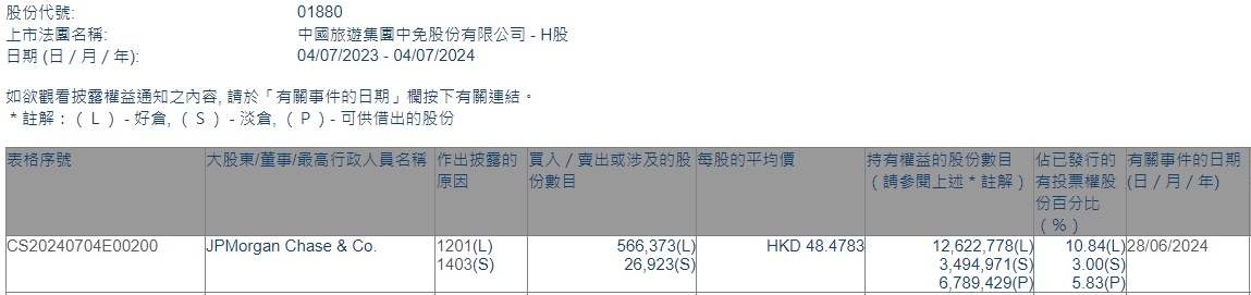智通财经APP获悉,香港联交所最新资料显示,6月28日,小摩减持中国中免(01880)56.6373万股,每股作价48.4783港元,总金额约为2745.68万港元。减持后最新持股数目约为1262.28万股,最新持股比例为10.84%。