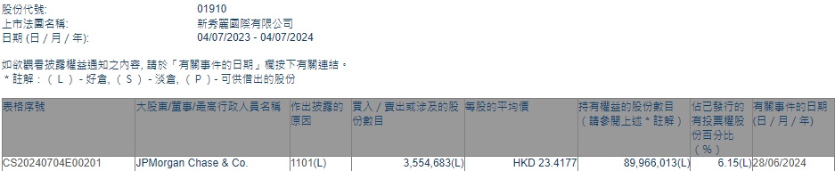 智通财经APP获悉,香港联交所最新资料显示,6月28日,摩根大通增持新秀丽(01910)355.4683万股,每股作价23.4177港元,总金额约为8324.25万港元。增持后最新持股数目约为8996.60万股,最新持股比例为6.15%。