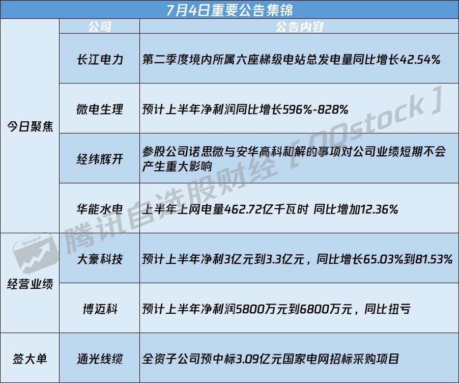 1、长江电力:第二季度境内所属六座梯级电站总发电量同比增长42.54%