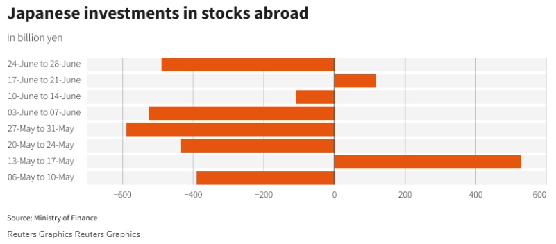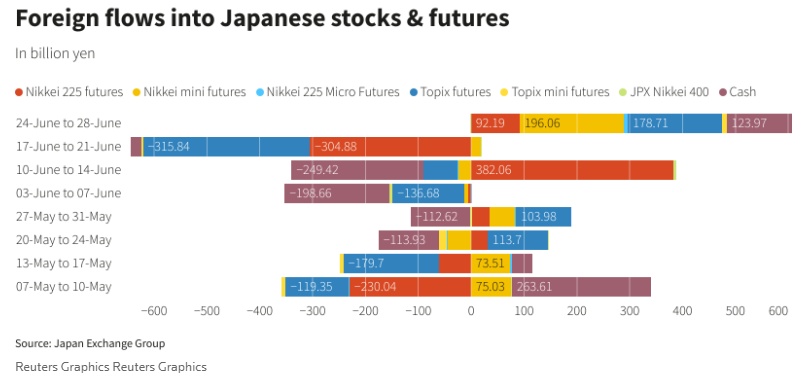 根据交易所数据,截至6月28日当周,跨境投资者净买入价值6049.3亿日元的日本股票,为4月12日以来最大单周净买入额。