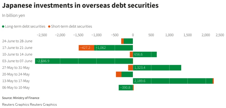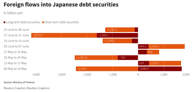 不过,日本财务省的数据显示,海外投资者从日本长期债券中撤出约1,309亿日元,连续第三周出现净抛售。