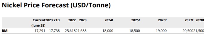 在2024年之后,BMI预计镍价将稳步上涨至2028年,随着市场过剩在电池金属需求激增的背景下缩小,镍价将升至2.15万美元。