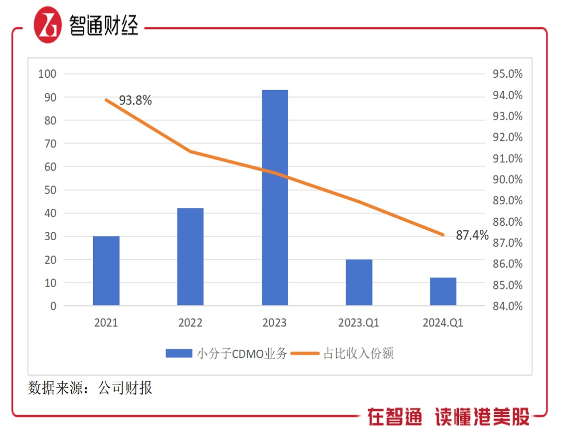 而小分子CDMO业务一直为该公司核心业务,商业化项目占比近80%,2024年Q1,业务收入12.23亿元,收入同比下降达39%,占比总收入87.4%。以客户来看,受大订单影响,收入来自跨国大制药公司收入下滑至4.82亿元,不过来自中小制药公司收入平稳增长,9.18亿元,同比增长13.02%,收入份额提升至65.6%。