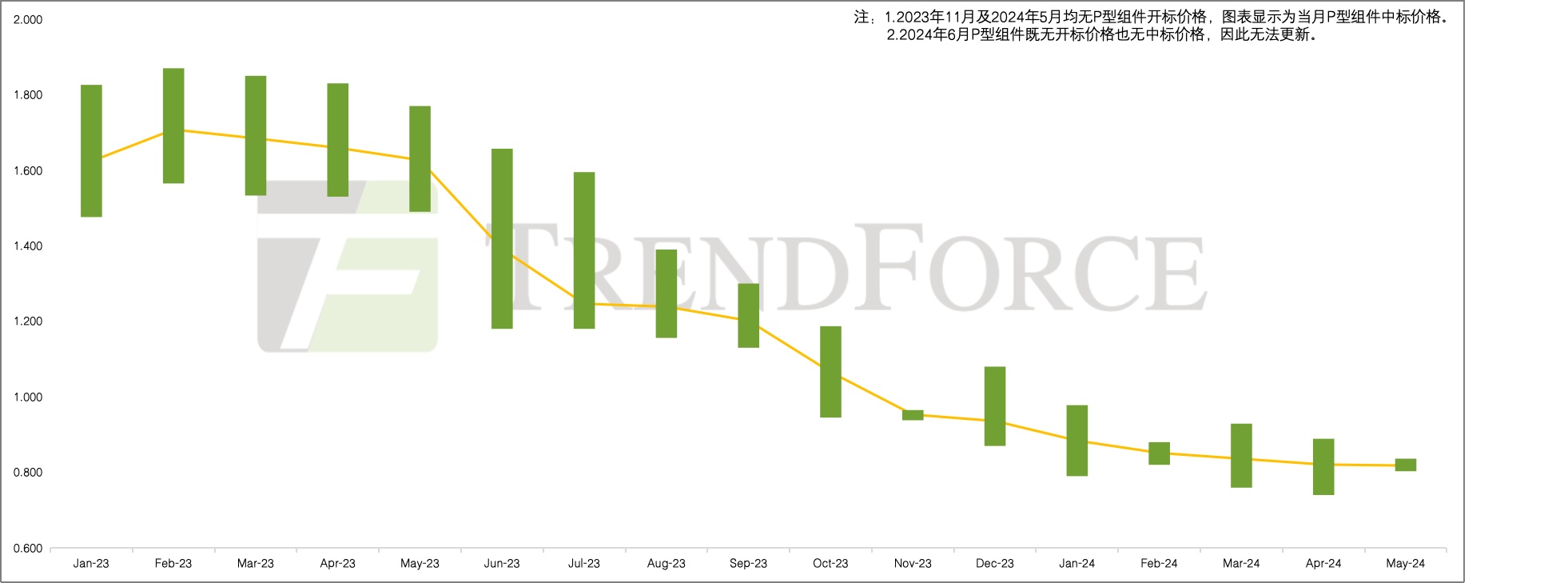 图:2023年-2024年6月P型组件月度开标价格趋势(元/W)