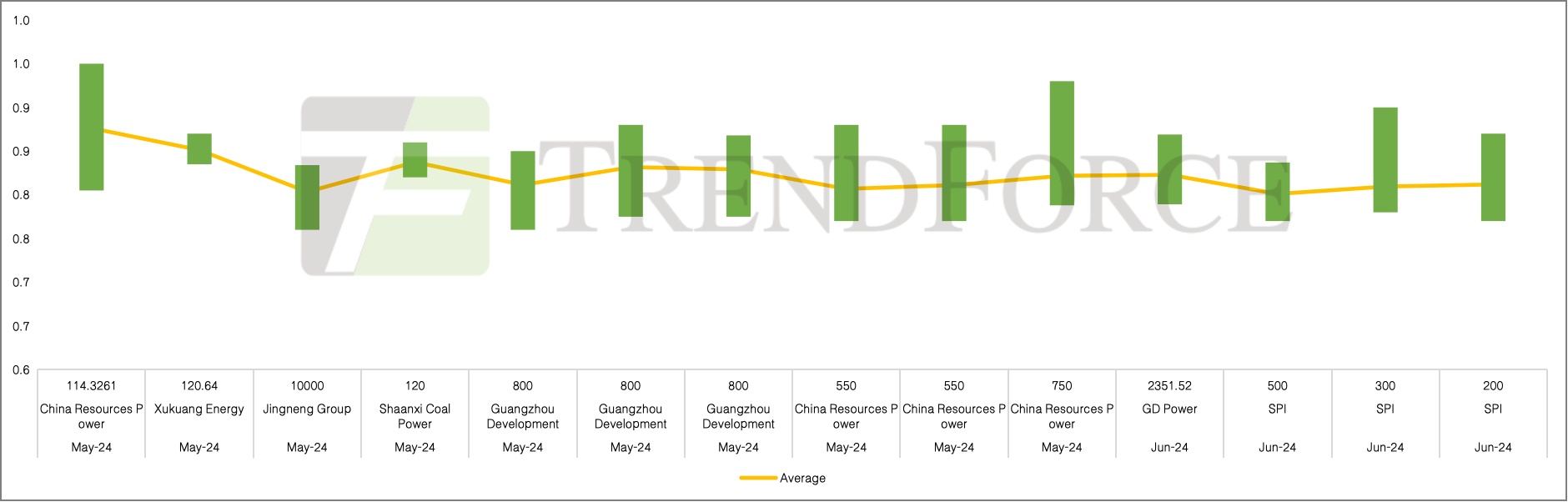投标价格方面,2024年H1共有约29GW P型组件项目集采开标(包含部分综合报价项目),各项目投标价格在0.74元/W-0.978元/W之间,随着组件上游价格的持续下滑,组件开标价格也跟随下滑,4月P型组件投标均价已降至0.82元/W,较2023年12月下降12%,且P型组件需求减少明显,5-6月均无P型组件集采项目开标。