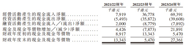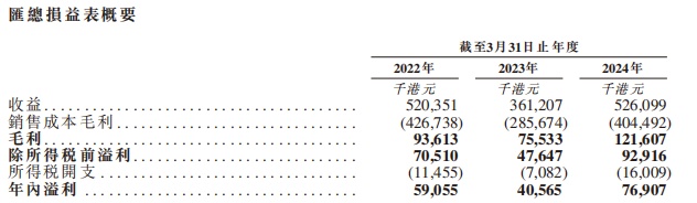 财务表现来看,2021/22财年至2023/24财年(以下简称:报告期内),盈利营造的营收波动较大,分别为5.20亿元(单位:港元,下同)、3.61亿元及5.26亿元;同期年内利润分别约为5905.5万元、4056.5万元及7690.7万元。就利率来看,报告期内,公司的毛利率分别约为17.99%、20.91%及23.11%,稳中有升;同期净利率分别约为11.35%、11.23%及14.62%。