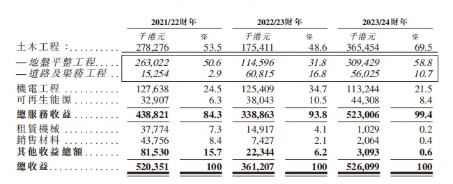 过往期间,荣利营造主要从事香港公营项目。报告期内,公营项目主要涉及地盘平整工程以及道路及渠务工程项目,产生服务收益占总营收比例分别约为65.6%、58.4%及73.2%。