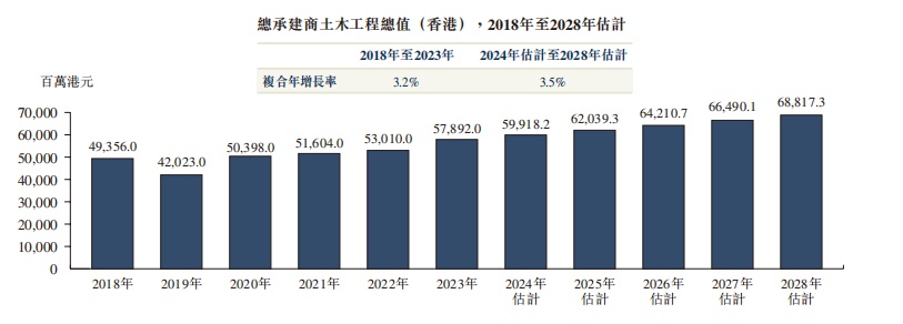根据政府统计处的数据,香港总承建商进行的土木工程总值由2019年至2023年的复合年增长率约为3.2%。未来数年,古洞北及粉岭北新发展区、明日大屿愿景项下的交椅洲人工岛、东涌新市镇扩展等项目相继落成及开展,将维持土木工程的需求,预计香港土木工程总值将于2024年至2028年期间以3.5%的复合年增长率增长。
