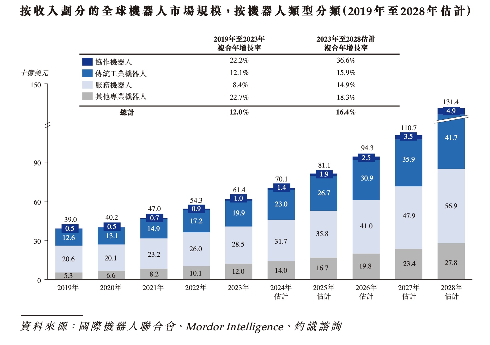 从行业规模来看,按销售收入计,全球协作机器人行业由2019年的4.67亿美元增加至2023年的10.40亿美元,复合年增长率为22.2%。预期市场规模于2028年将达49.5亿美元,期间复合年增长率为36.6%。协作机器人市场的快速增长主要受多项关键因素推动。AI集成等技术进步不仅提高协作机器人的能力,亦带来规模经济效益,从而降低成本,使协作机器人更实惠。此外,人口老龄化导致劳动力短缺及劳动力成本上涨,亦使得市场对自动化的需求更加殷切。因此,商业行业的公司在无人零售、辅助备餐及其他服务等使用场景采用协作机器人更趋普及,以提高营运经济效益。在这样的背景下,协作机器人的市场增速远超其它类型的机器人。