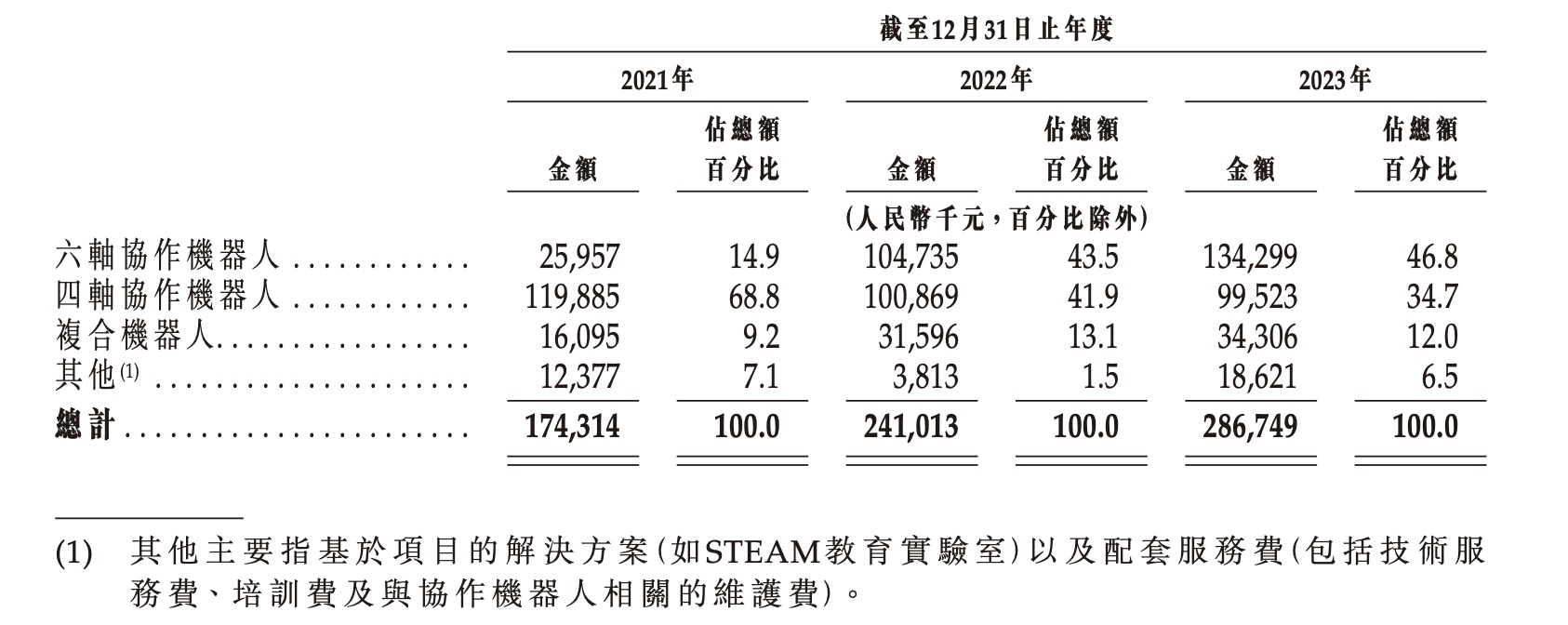 其中,公司主要销售CR系列及Nova系列的六轴协作机器人,目前公司共有22个六轴型号的协作机器人。报告期内,来自该类型的产品的收入及收入占比大幅增长,分别为2595.7万元、1.05亿元及1.34亿元,营收占比则由2021年的14.9%增长至2023年的46.8%,成为了公司目前最主要的营收来源。