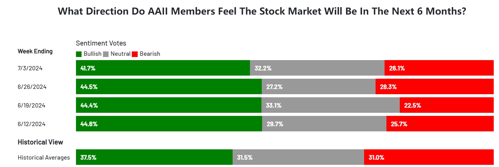 在美国个人投资者协会(简称AAII)最新公布的散户投资者多空情绪调查中(截至7月3日当周),仅仅有26.1%的受访者表示,他们认为未来六个月市场将呈下跌趋势,而上周这一比例为28.3%,相比于历史平均值31%更是大幅降温。