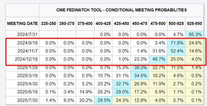 然而,在利率期货市场,交易员们纷纷转向押注9月份为美联储激进加息周期以来的首次降息。“CME美联储观察工具”显示,利率期货交易员们对于9月份首次降息的押注力度全面升温,9月降息概率从最新的非农数据以及失业率公布之前的不到50%,大幅跃升至当前的高达71.8,同时还押注第二次降息为12月份,概率接近50%。