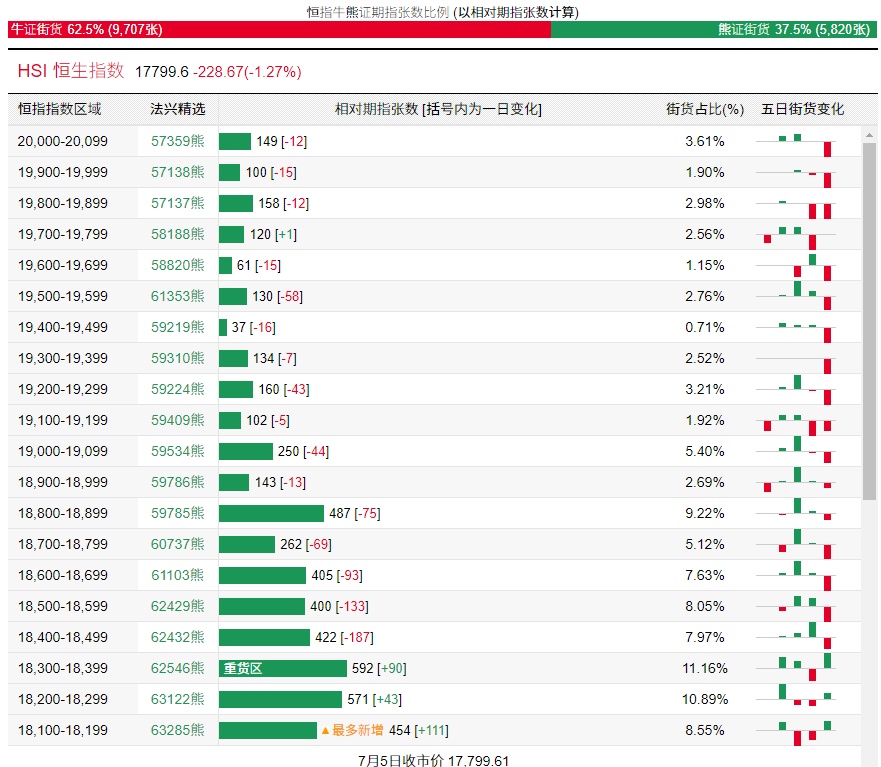智通财经APP获悉,截至7月6日,恒指最新的牛熊街货比例为62.5:37.5。