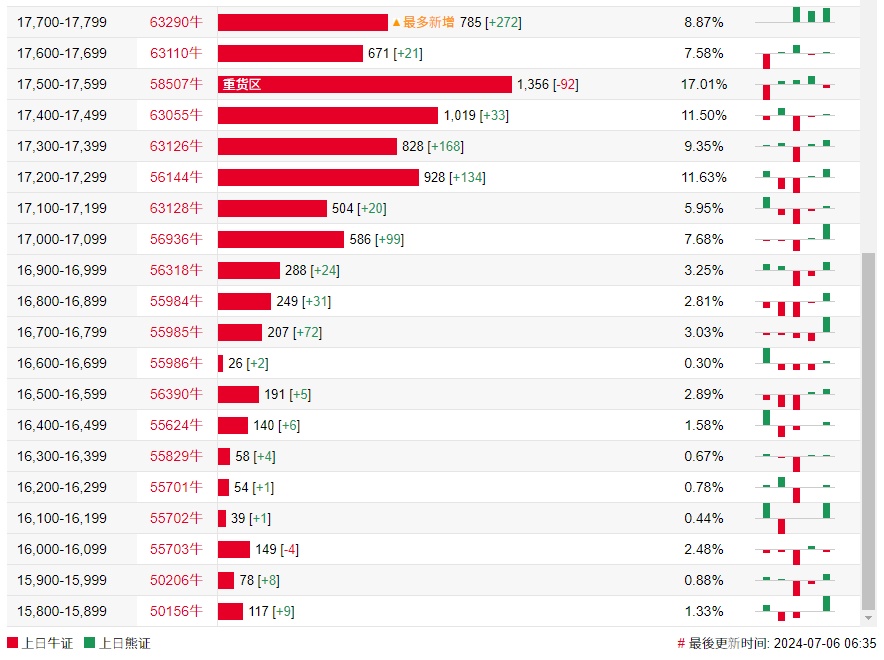牛证街货重货区在17,500-17,599区间,该区间最新牛证数量为1,356张,较上一交易日减少82张;最多新增在17,700-17,799区间,该区间最新牛证数量为785张,较上一交易日增加272张。
