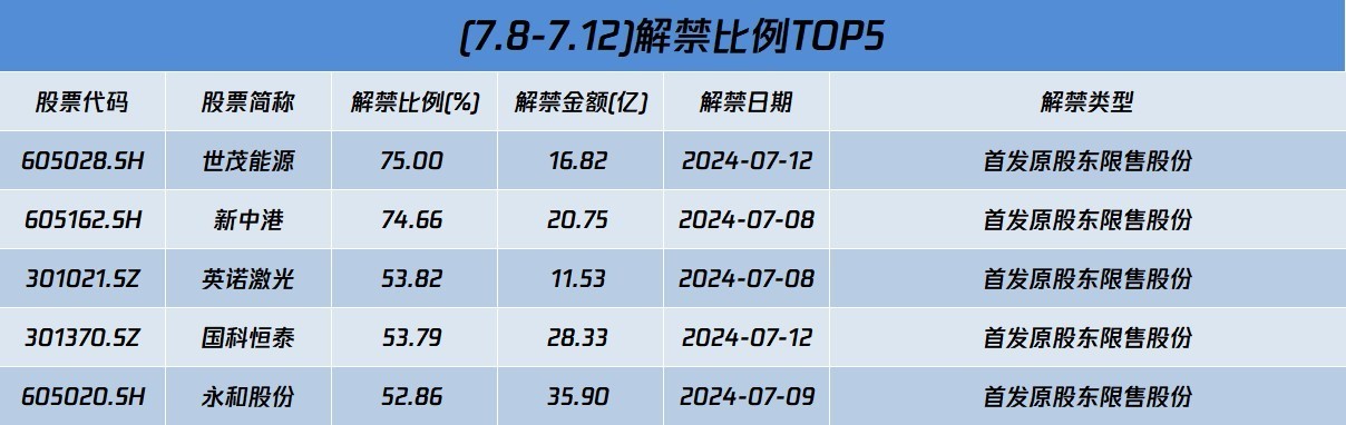 从解禁比例来看,本周世茂能源实际解禁比例达75%,其次解禁比例居前的分别为新中港和英诺激光。
