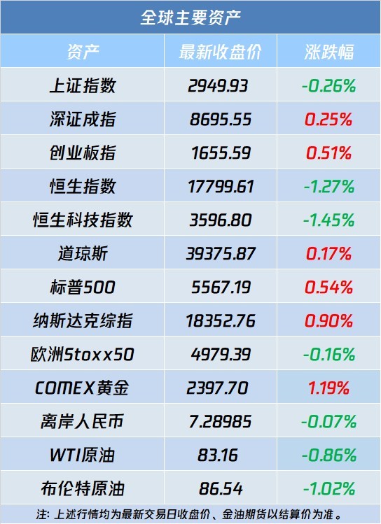 自选哥提示:周五美股集体收涨,标普500指数和纳指再创收盘新高。其他市场方面,COMEX黄金期货涨1.19%,报2397.7美元/盎司;纽约商品交易所8月交货的轻质原油期货收于每桶83.16美元,跌幅为0.86%。