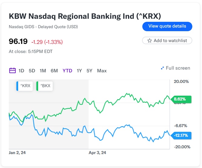 尽管股市上的表现并非如此。写字楼、公寓楼或其他商业地产的价值不断下跌,一直是影响所有银行股价的一个因素,尤其是小型银行。KBW地区银行指数今年下跌了约12%,而反映大型银行的KBW纳斯达克银行指数则上涨了近9%。
