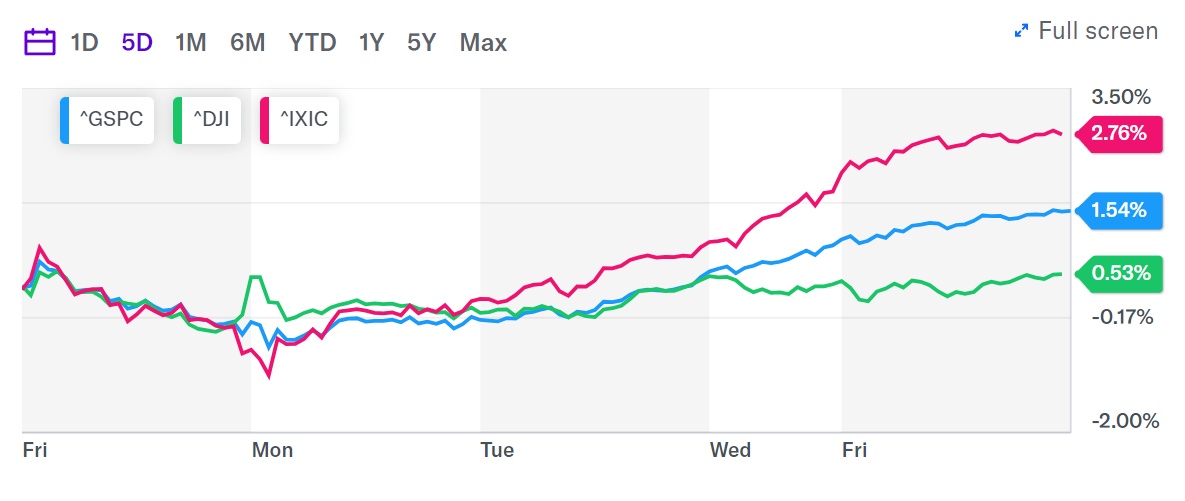 上周,标准普尔500指数上涨近2%,纳斯达克综合指数上涨逾3%。这两项指标本周均创下历史新高。今年以来表现明显滞后的道琼斯工业股票平均价格指数仅上涨了0.5%。
