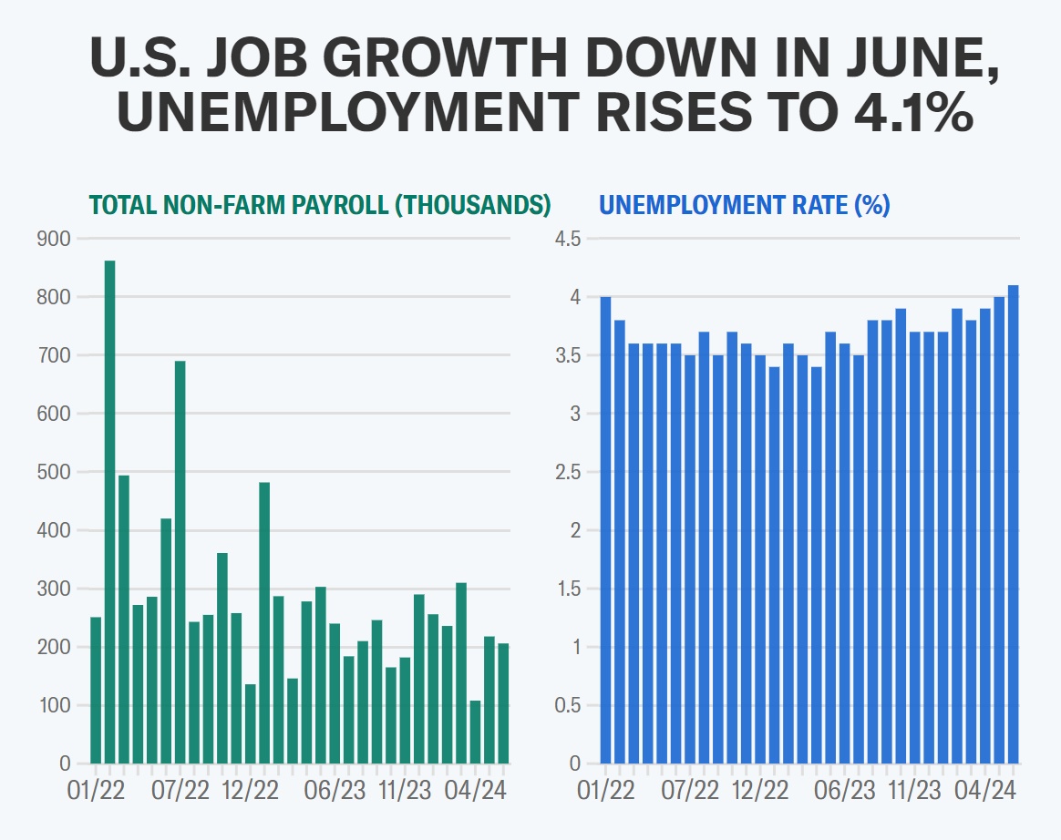 失业率升至4.1%,为2021年11月以来的最高水平。与此同时,4月和5月的就业增长被下修了11.1万个,表明过去几个月劳动力市场的强劲增长并不像最初想象的那样强劲。