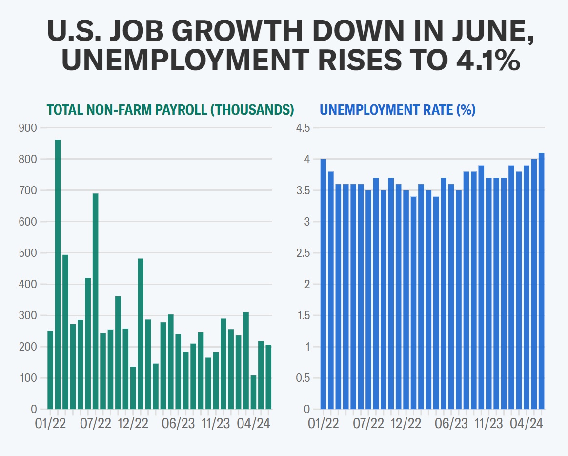 当美国经济从新冠疫情中复苏时,就业市场出现了惊人的复苏,最终导致失业率在2023年首次降至半个世纪以来的最低点3.4%。然而,最近失业率有所放松,目前失业率为4.1%,为2021年11月以来的最高水平,新申请失业救济的人数呈上升趋势。
