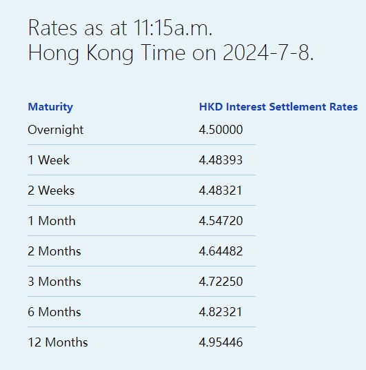 智通财经APP获悉,7月8日,港元拆息涨跌不一,隔夜息微跌近3基点至4.5%,而与楼按相关的一个月拆息亦结束七连跌,回升3.5基点至4.5472%,创近一周新高;反映银行资金成本的三个月拆息微跌至4.7225%,为6月5日以来最低。
